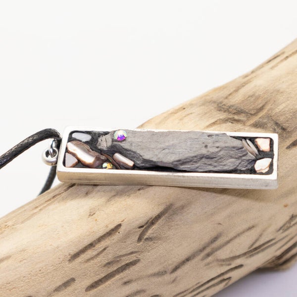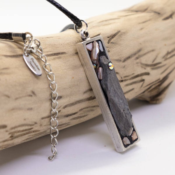 ***Beautiful antique silver plated pendant with slate and mother of pearl.