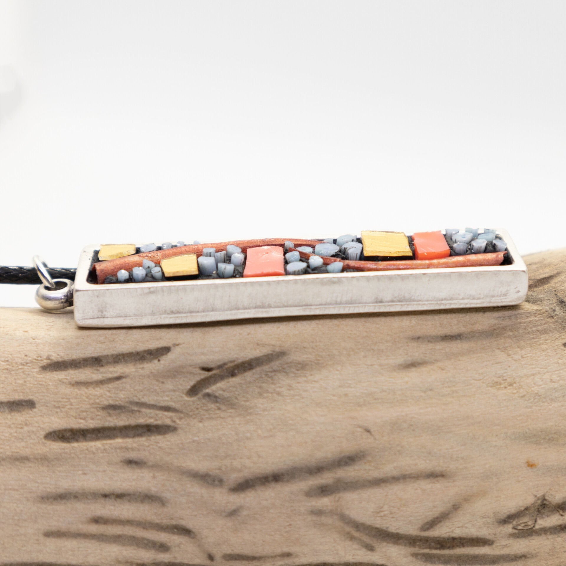 Prachtige moderne hanger met strepen van 24k goud smalti (italiaans glas) en oranje/blauw glas.
